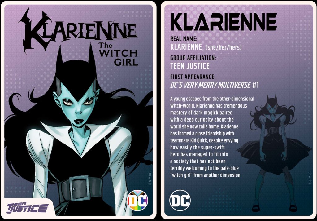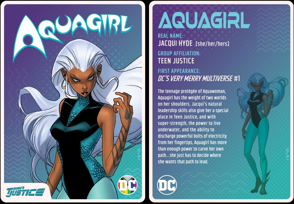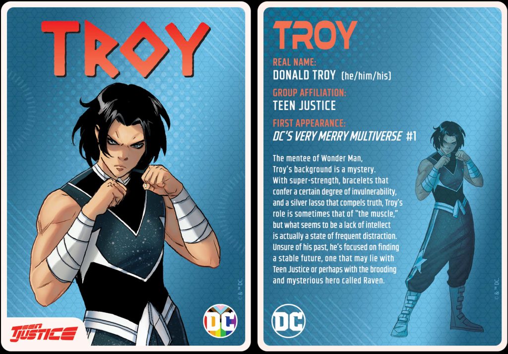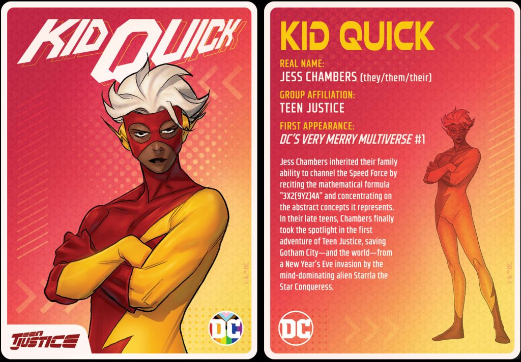 Looking for a primer on the Earth-11 heroes of Multiversity: Teen Justice? DC has produced a series of trading card-style biographies of the main cast! Kid Quick—the Future State Flash—and their fellow heroes Supergirl, Robin, Aquagirl, Klarienne the Witch Girl, and Troy take center stage in a miniseries that rocks Earth-11 to its core! Get a few insights into the Teen Justice team dynamics in their descriptions below: